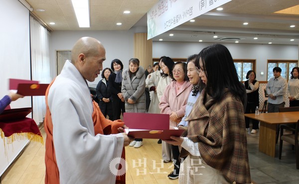 이날 수료식은 개식 선언을 시작으로 삼귀의례, 수료증 수여, 주지 스님 격려사, 단체 기념촬영, 공지 및 폐식 순으로 진행됐다. 이날 행사에서는 수료생과 연구소 관계자, 2기 입문자 과정 신입생들이 함께하는 점심 공양과 소통의 시간이 마련돼 그간의 배움과 수행의 의미를 되새겼다.